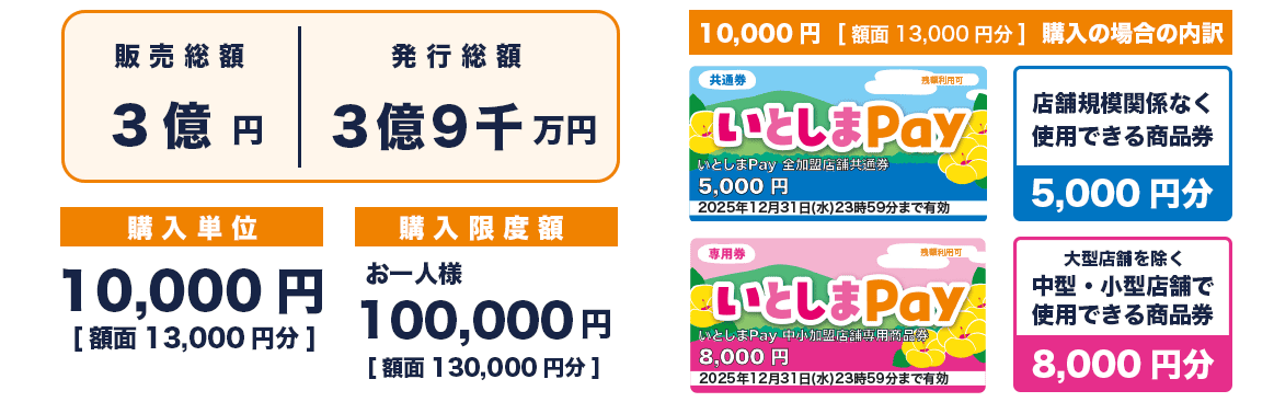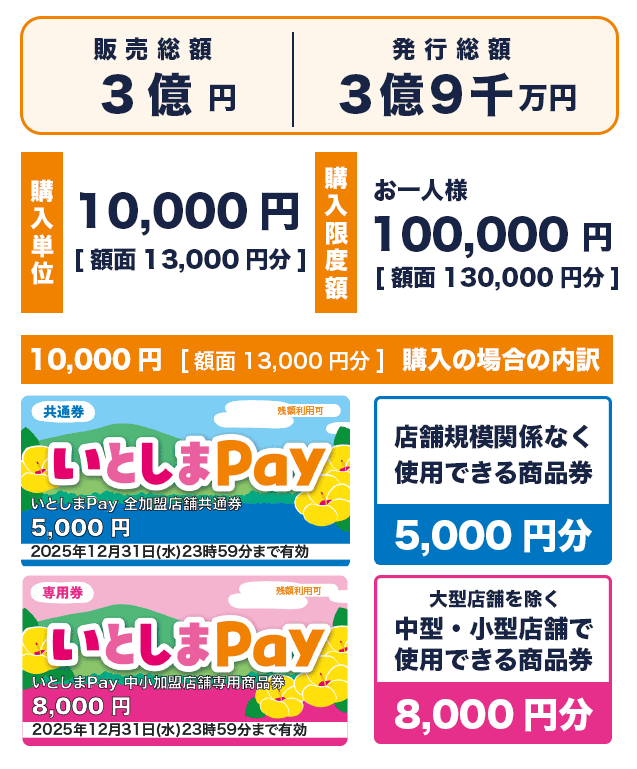 いとしまPayは、加盟店舗どこでも使える「全加盟店舗共通券」5,000円分と、中小店舗のみで使える「中小加盟店舗専用商品券」8,000円分の1セットを10,000円で購入できます。