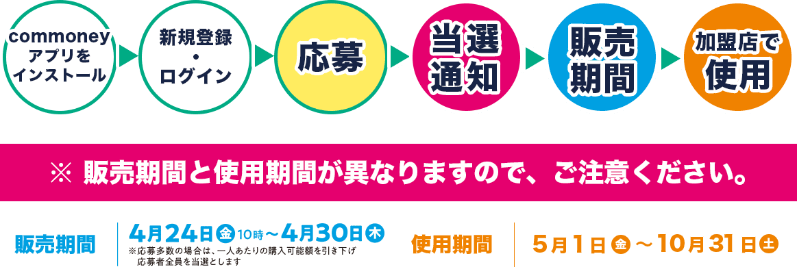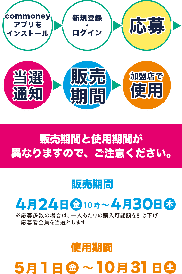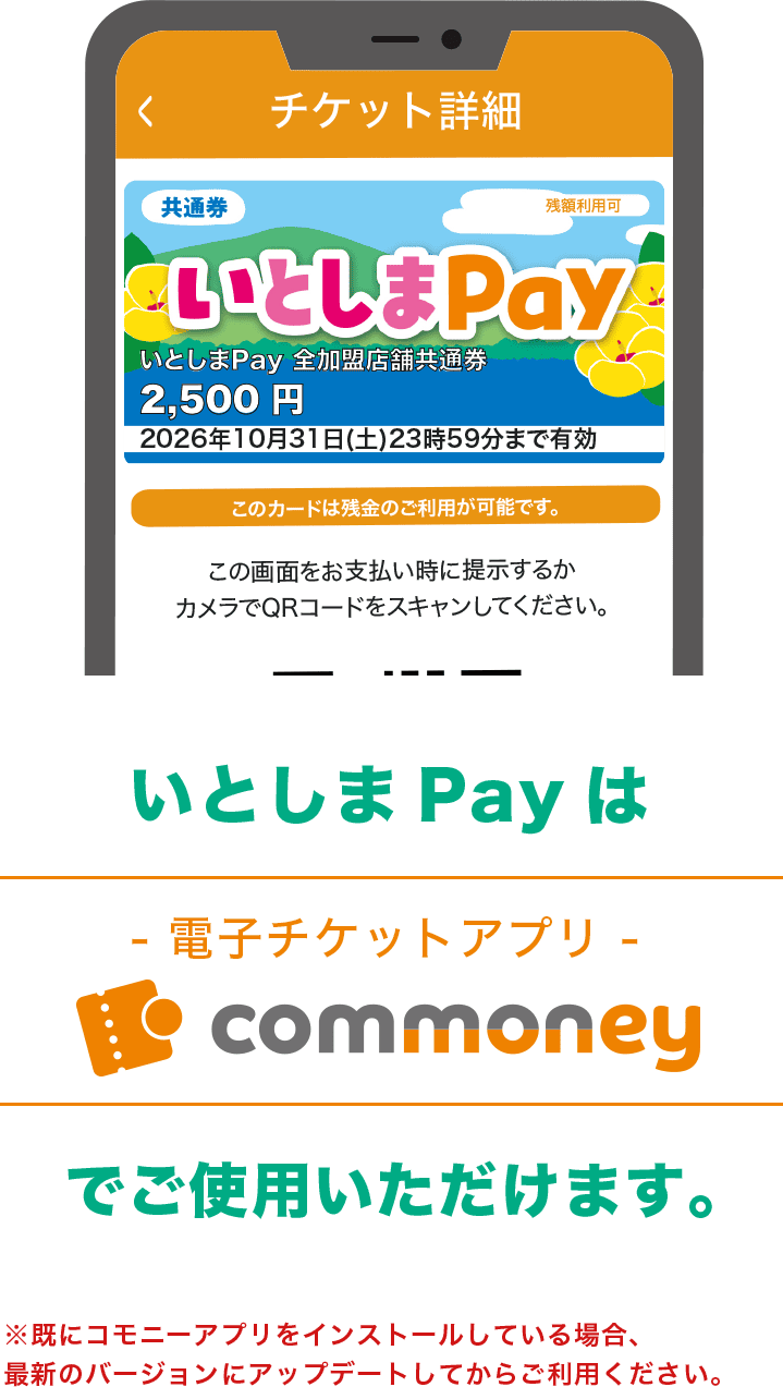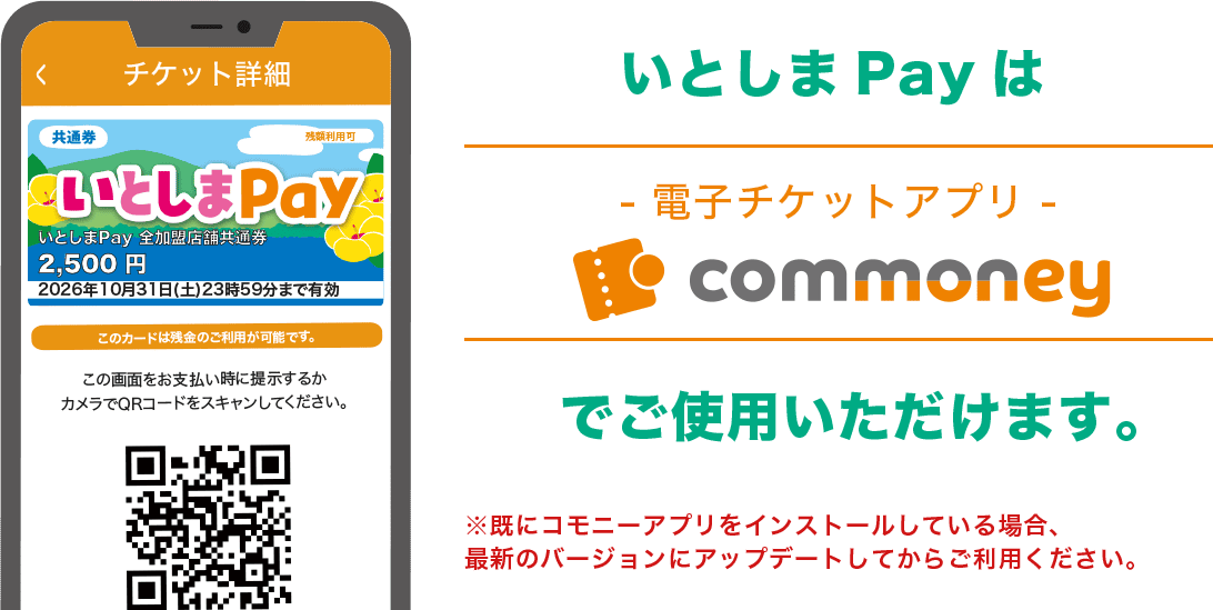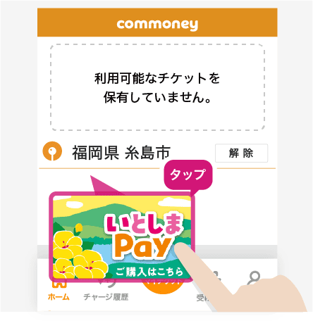 スマートフォン専用電子チケットアプリcommoney内「いとしまPay」に事前応募し、当選者はアプリ内に通知があります。アプリ内でクレジット決済またはコンビニにて現金を支払うことで使用できるようになります。