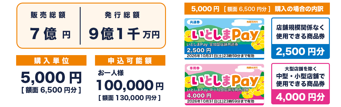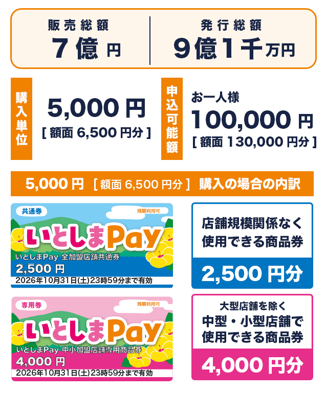 いとしまPayは、加盟店舗どこでも使える「全加盟店舗共通券」2,500円分と、