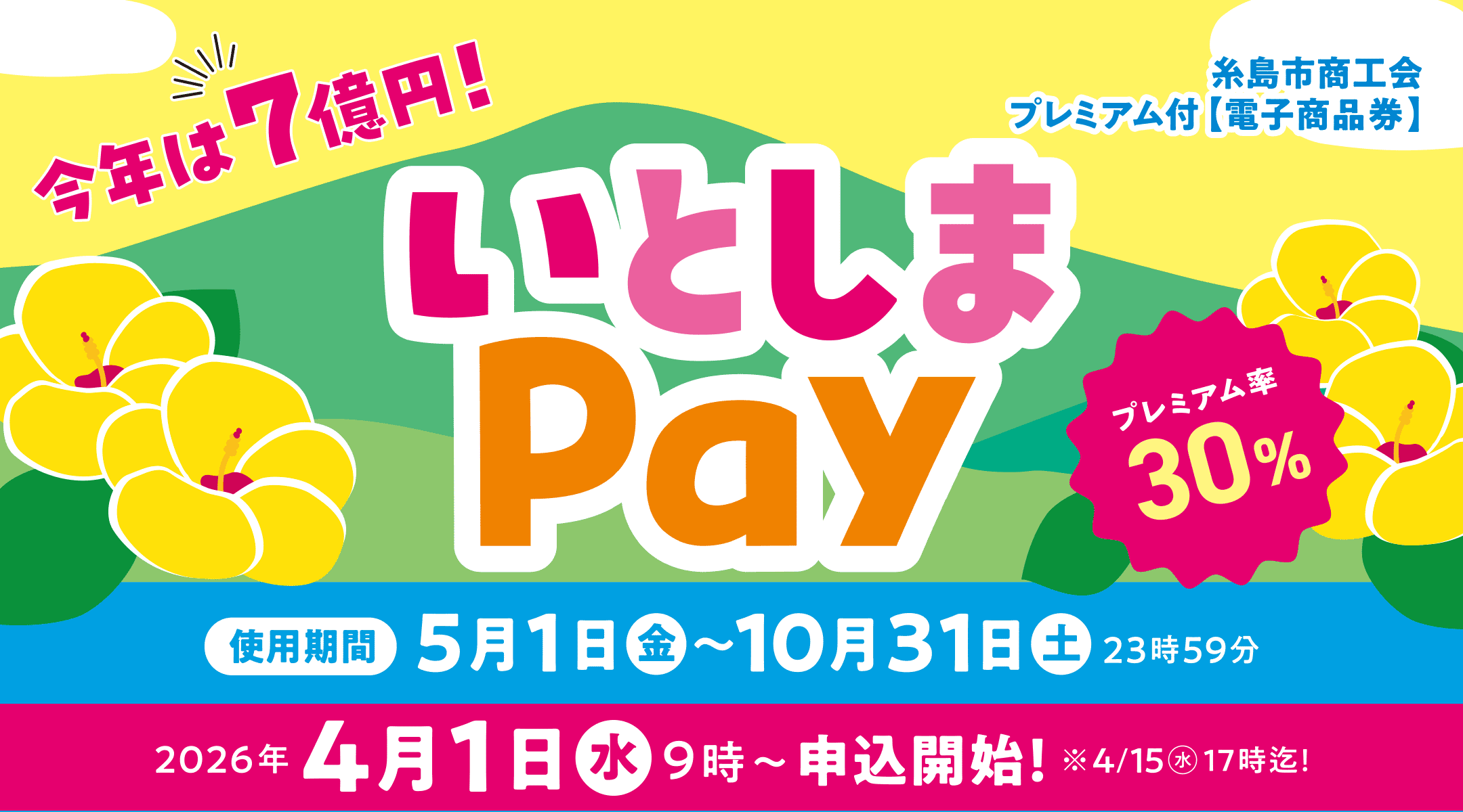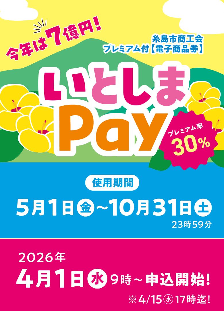 糸島市内の加盟店舗で使えるプレミアム率30%のお得な電子商品券です。