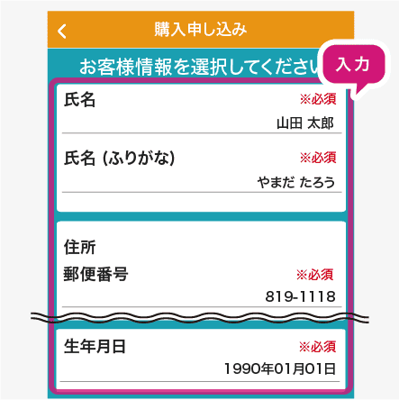 お客様情報「氏名」「住所」「生年月日」を入力