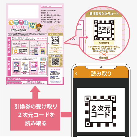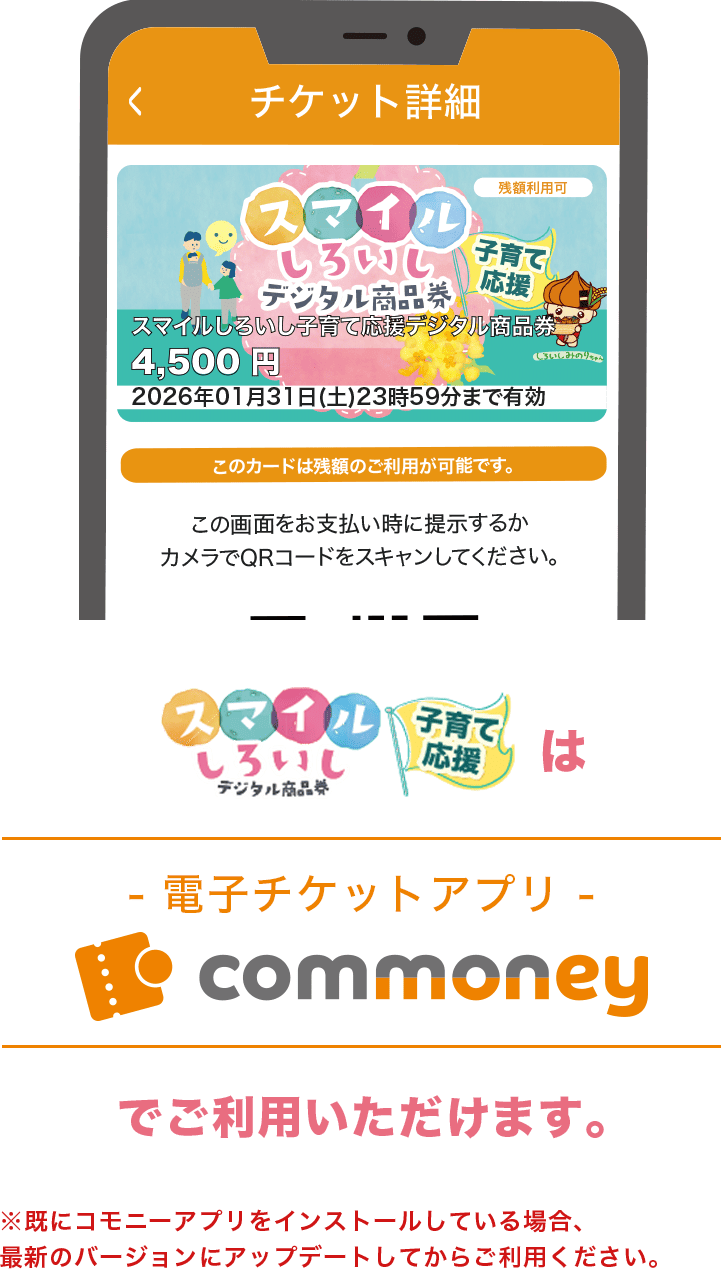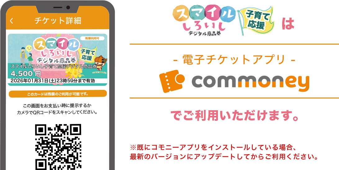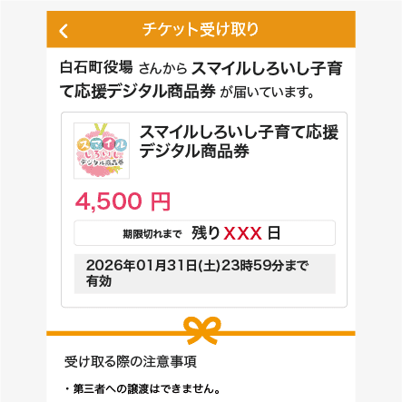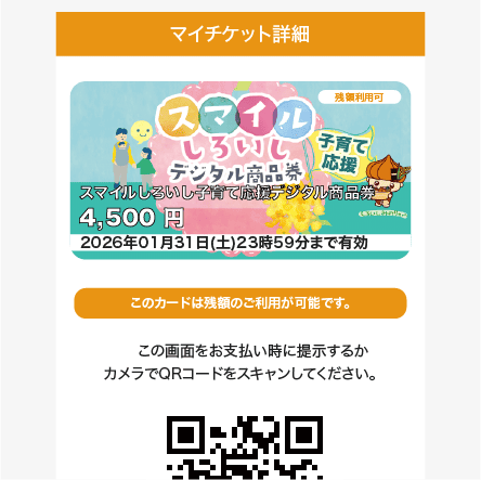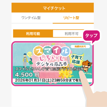 アプリ内マイチケットから「スマイルしろいし子育て応援デジタル商品券」を選択します。