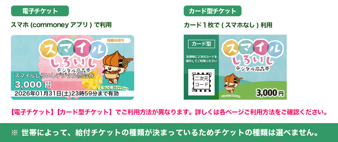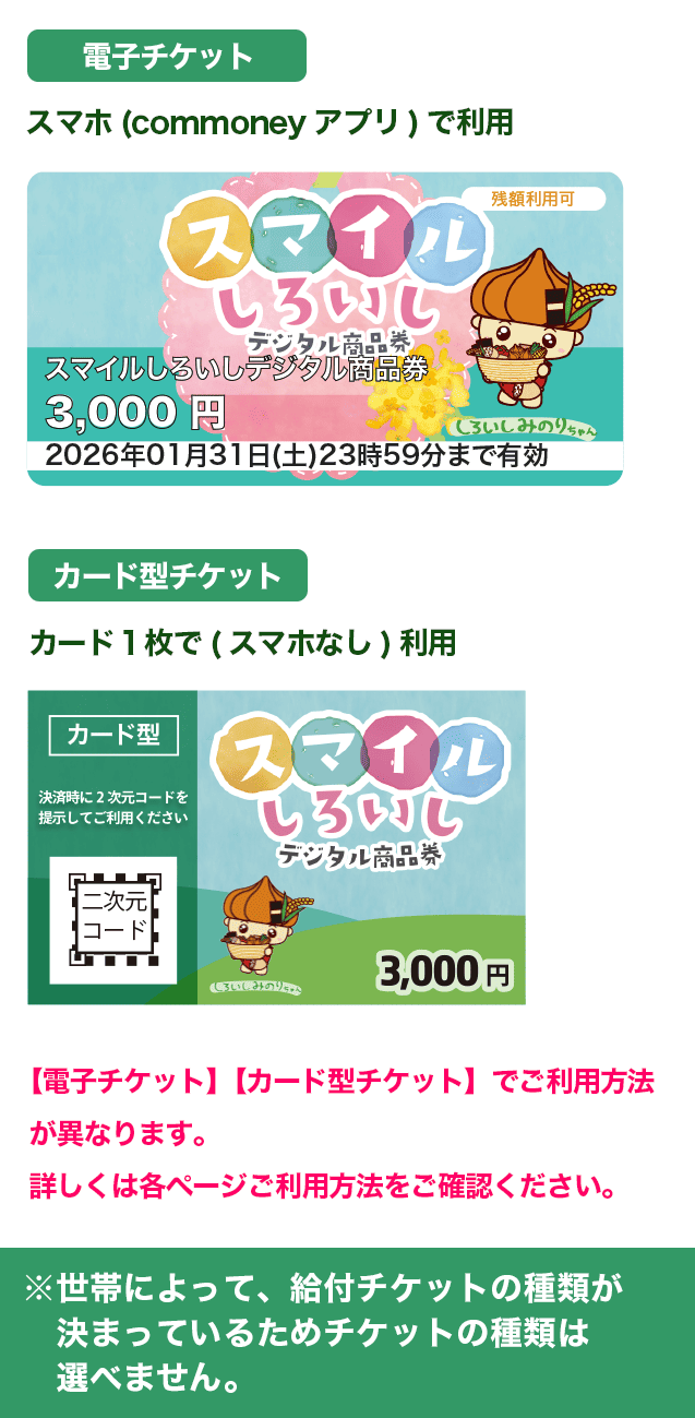 アプリ内マイチケットから「スマイルしろいしデジタル商品券」を選択します。