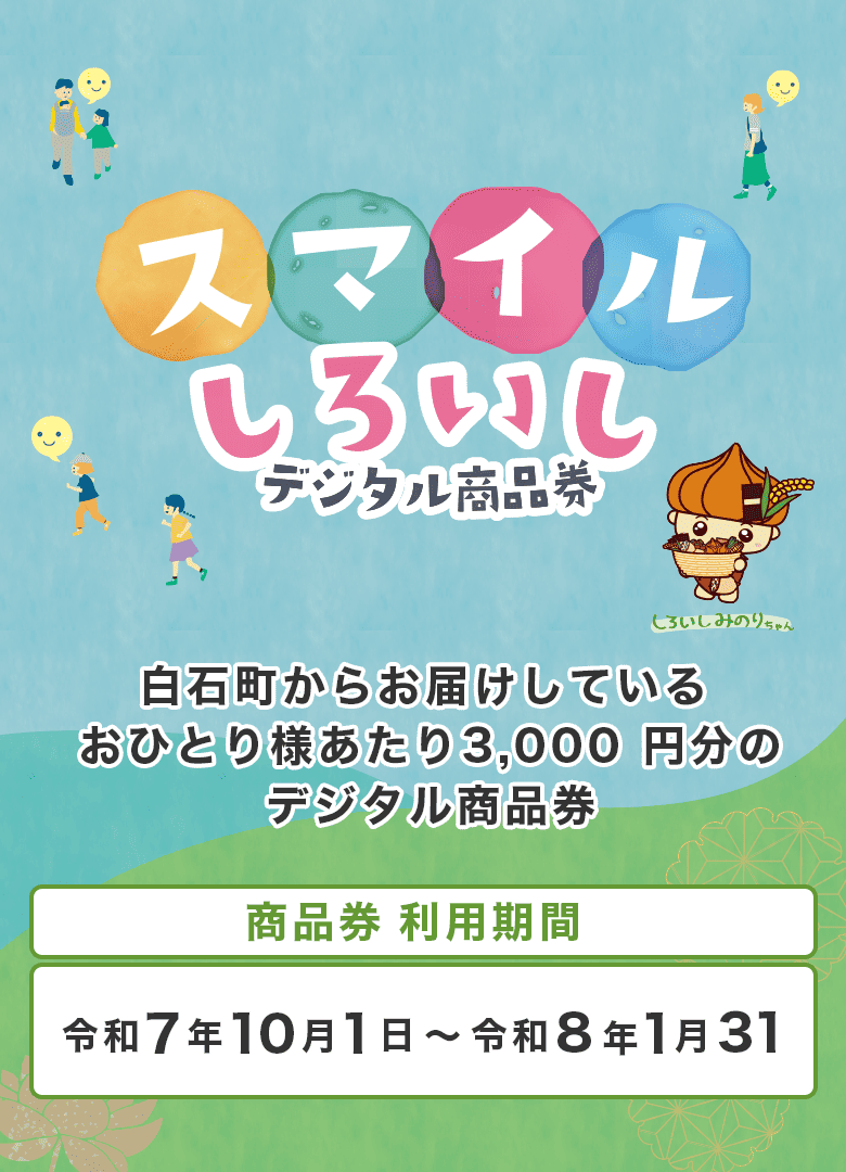 佐賀県白石町ではエネルギー・食料品価格等の物価高騰の影響を受けた町民生活の負担軽減を目的に一人当たり3,000円分の『スマイルしろいしデジタル商品券』を町民の方に給付します。