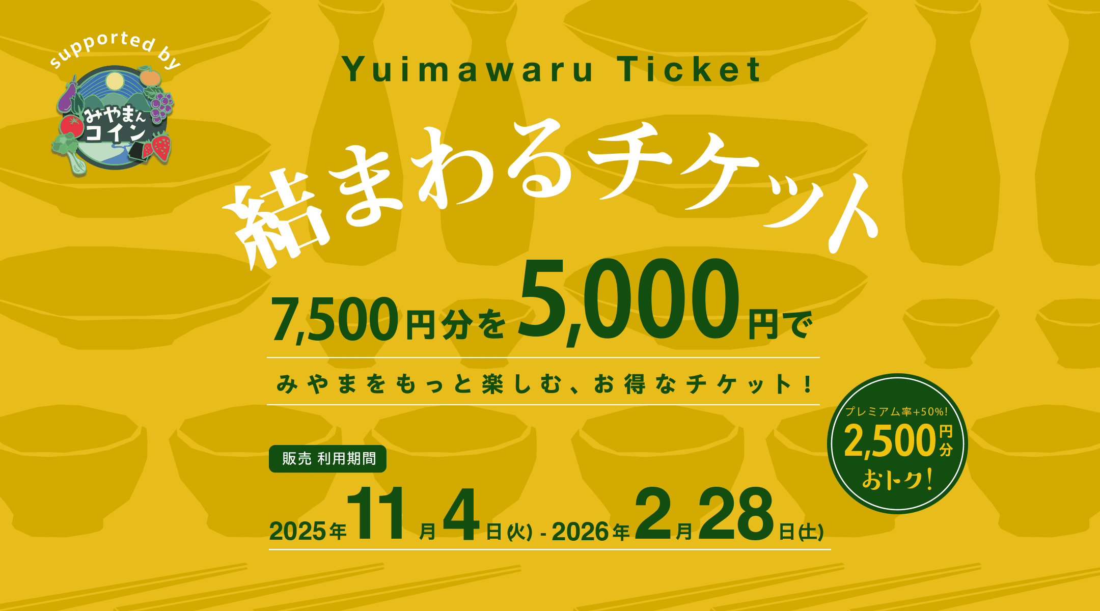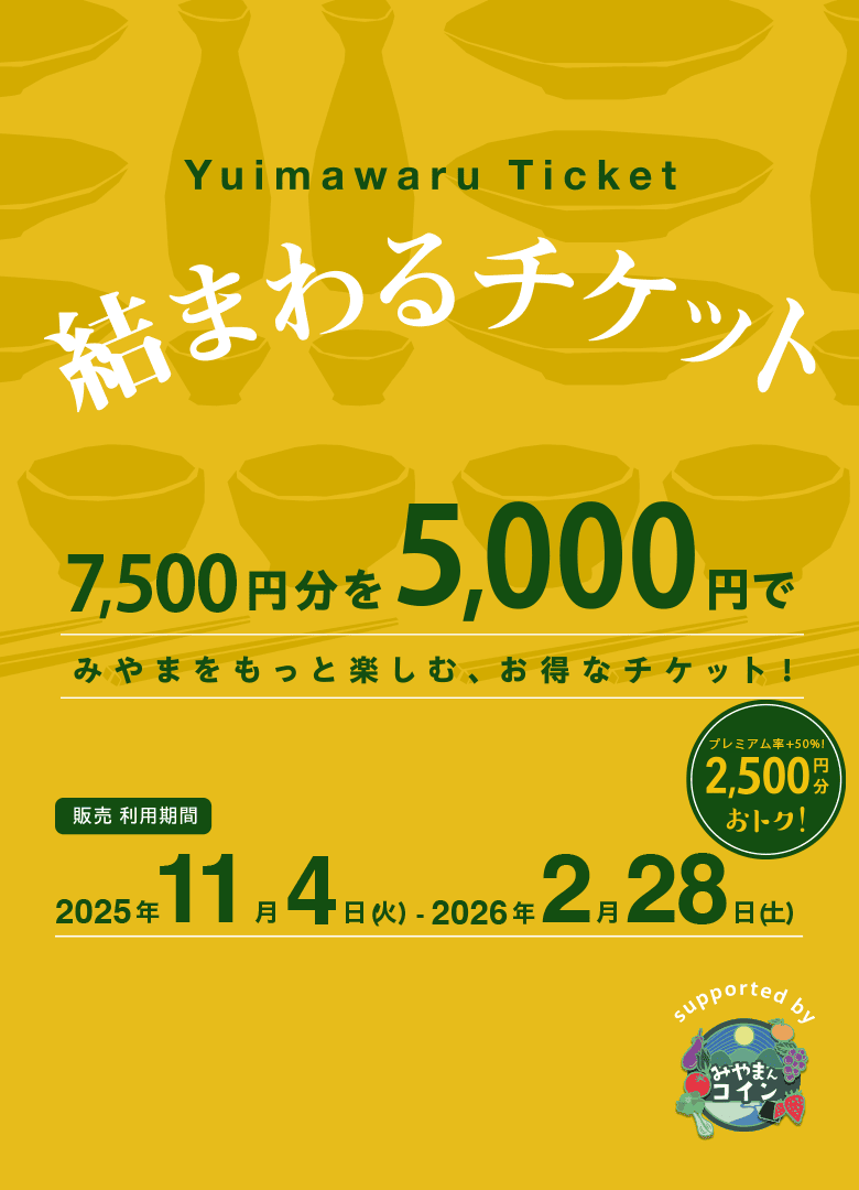 結まわるチケット加盟店での飲食・タクシーに使える1口7,500円分を5,000円で購入(プレミアム率50%)できるお得なチケットです。