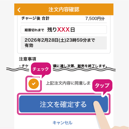 下にスクロールし問題がなければ同意にチェックを入れ「注文を確定する」をタップ