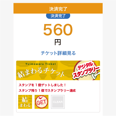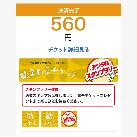 | スタンプの集め方 | 結まわるチケットを購入し対象店舗で利用すると1店舗につきスタンプ1個をもらえます |